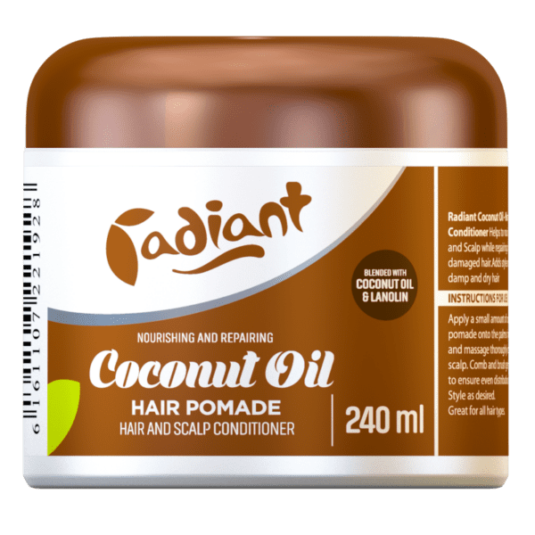 Radiant coconut oil -Hair and Scalp conditioner- Helps to nourish the hair and scalp while repairing dry and damaged hair . Adds style and shape to damp and dry hair.